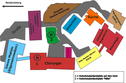 Die Klinik verfügt außerdem über zwei eigene Hubschrauber-Landeplätze, um Patienten von weit entfernten Kliniken oder Schwerverletzte aus dem Umkreis von Neidertsberg und Dillfingen aufzunehmen.