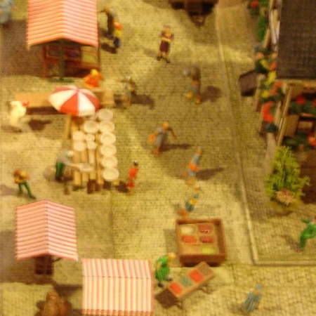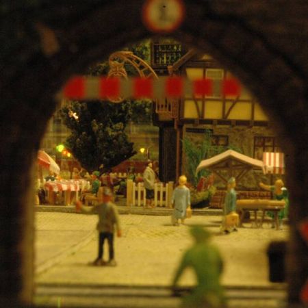 Auf der Straßenbahnanlage sind zwei durch eine Straßenbahnlinie verbundene Bezirke einer Kleinstadt dargestellt. Es handelt sich um die Altstadt und einen neueren Stadtteil, die durch eine dazwischen liegende Parkanlage, den Rosengarten, getrennt sind.
