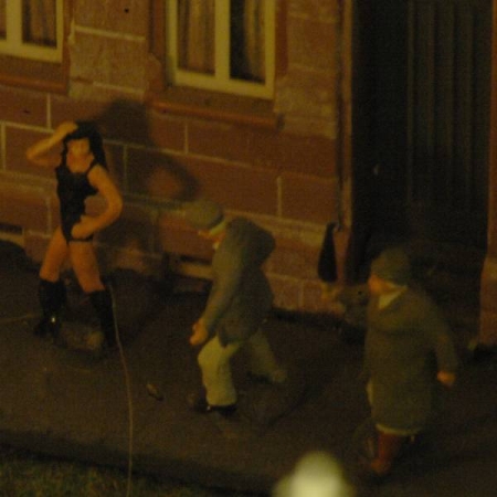 Von der Haltestelle Rosengarten fährt die Straßenbahn zwischen einem Wohnblock und dem Park zur großen Umsteigehaltestelle Neuhaus weiter. Im Innenhof des Häuserblocks sind viele interessante, kleine Szenen zu sehen.