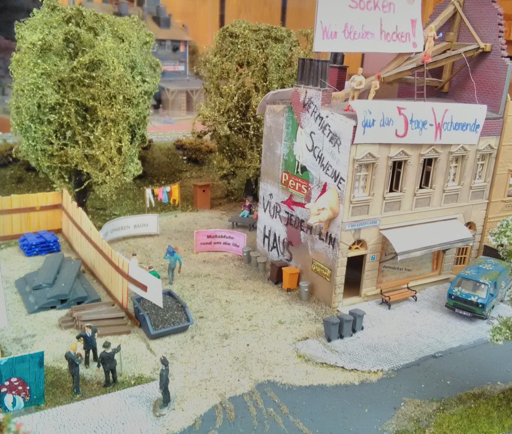Normalerweise wird auf der Modellbahn immer die „heile Welt“ dargestellt. Auf diesem Diorama hat sich neben einem Abrisshaus eine Hausbesetzter-Kommune niedergelassen. Die „Bewohner“ versuchen die Neubaupläne des örtlichen Immobilien-Hais zu verhindern und wollen nebenbei die Welt verbessern. Übrigens: auf der Bautafel nebenan sind verschiedene Clubmitglieder mit fiktiven Firmen verewigt.
