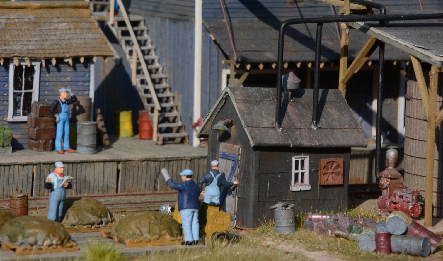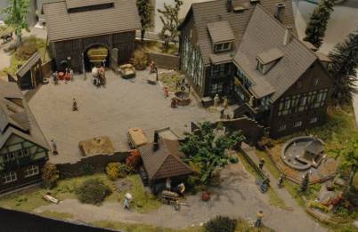 Ausgangspunkt dieses Schaustücks war ein Werbediorama der Firma Vollmer, wie es als Werbung für Neuheiten in Geschäften oder auf Messen zu sehen ist. Die für diese Art von Diorama typische, eher nüchterne und detaillose Präsentation des Bausatzes, passte nicht so recht zu unseren Ansichten darüber wie so ein Modell aussehen sollte. Also entschloss man sich dazu, das Modell von Grund auf zu überholen. Dies beinhaltete zuerst einmal die Neuanordnung der Gebäude, eine Neugestaltung des Hofs mit neuem Platzbelag und mehr Details und schließlich der Alterung aller Elemente, um Betriebsspuren anzudeuten.