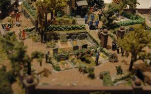 Dieser Herr arbeitet in diesem Bereich und die Erbauer und Gestalter dieses Schaustückes haben sich sehr intensiv mit der Materie befasst und sie fachmännisch in Szene gesetzt. Es fehlt fast kein Detail. Vom Pfarrer über Ministranten bis hin zu den Trauergästen und den Sargträgern sind alle beteiligten Personen anwesend. Die normalen und die neugierigen Friedhofsbesucher sind ebenso da. Auch der Blumenschmuck am offenen Grab wurde rechtzeitig vom Floristen an Ort und Stelle gebracht. Das Bukett auf dem Sarg als ein letzter Gruß spiegelt die Normalität wieder. Wir wünschen ihnen ein gutes Auge auch für diese (leider alltägliche) Szene.