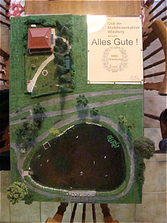 In ca. 3 Monaten Bauzeit entstand so mit Hilfe von Luftbildern und zahlreichen Fotos ein Diorama des Graf-Luckner-Weihers. Auf diesem Schaustück finden sich alle wesentlichen Details des Clubheims und der Umgebung wieder – die Mitglieder des MSC staunten nicht schlecht, wie genau wir ihr Gelände studiert hatten. Schiffe im Maßstab 1:100:87, diverse Ausstellungsstücke im Garten, der Graf-Luckner-Gedenkstein, die Teichrosen und Enten im See sind nur einige Beispiele dafür. Das Modell haben wir am 7. Juni 2009 bei der großen Jubiläumsfeier übergeben. Es ist im Clubheim des MSC ausgestellt und kann dort besichtigt werden.