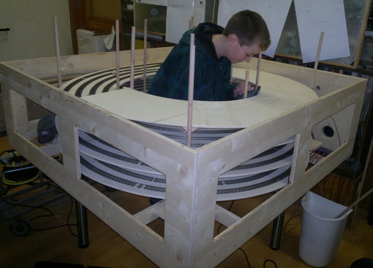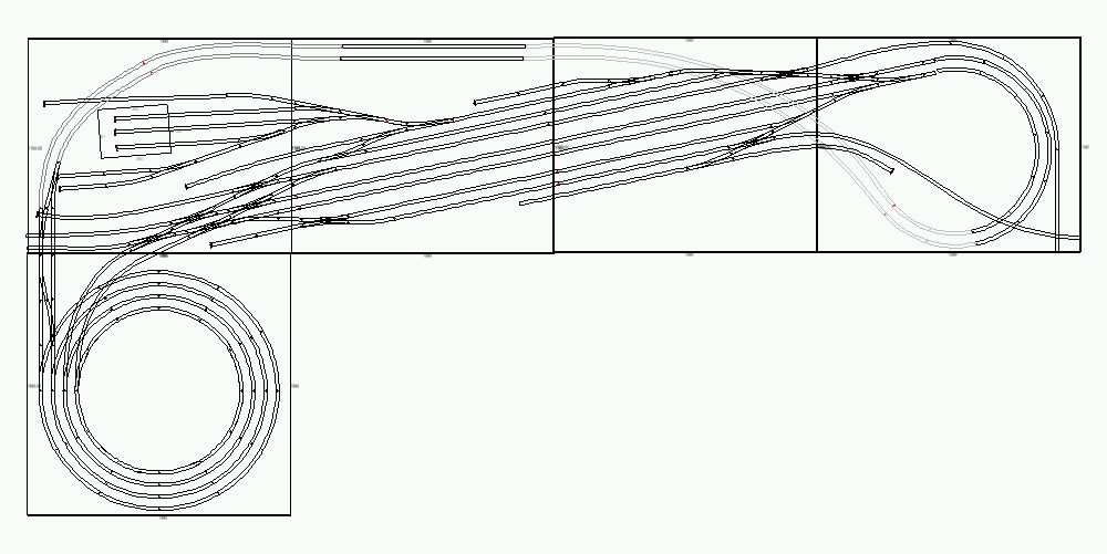 Seit Mitte 2013 bauen wir an einer speziell auf die Bedürfnisse dieser Präsentation zugeschnittene Anlage. Die Anlage besteht aus einem mittelgroßen Bahnhof mit kleinem Betriebswerk, sowie einer Ausbaustrecke um schnelle Zugfahrten zu ermöglichen. Ein Schattenbahnhof 35 cm unter dem Bahnhof erlaubt das Abstellen von langen Zügen. Ein viergleisiger Wendel verbindet alle Ebenen miteinander.